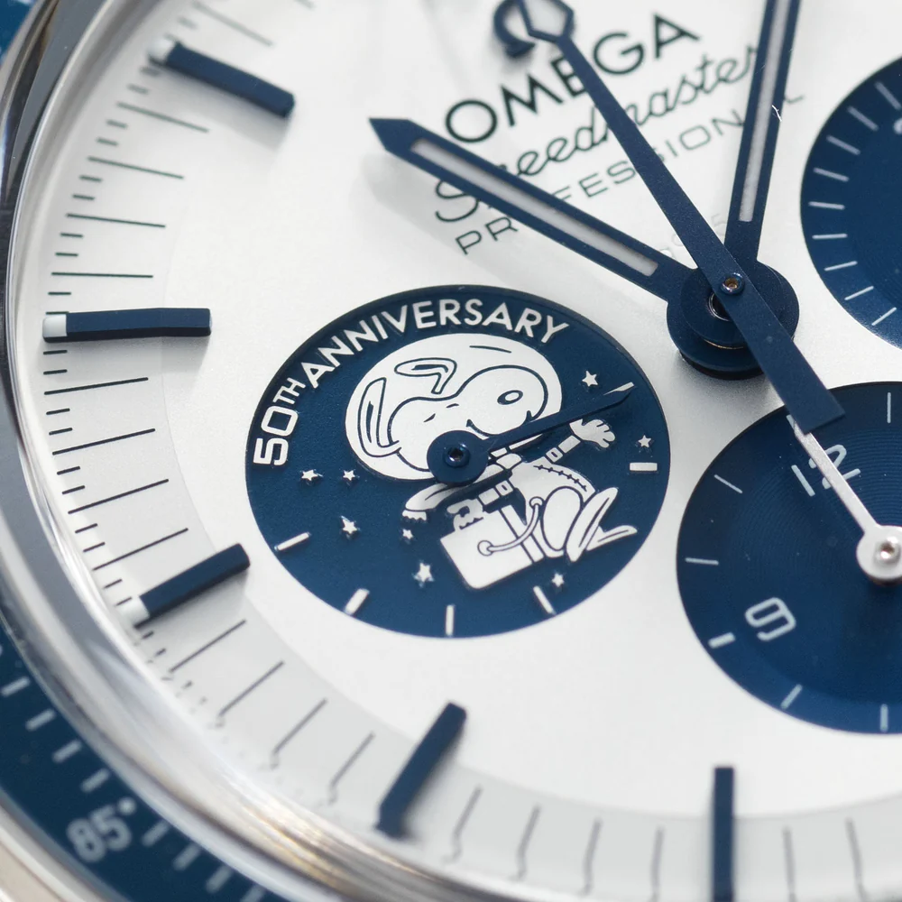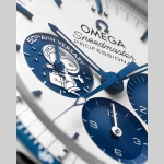 • This 50th anniversary timepiece pays tribute to the “Silver Snoopy Award” that OMEGA received from NASA astronauts in 1970, in recognition of the brand’s contributions to space exploration, including the Apollo 13 mission.The 42 mm case in stainless steel is presented on a blue nylon fabric strap, which features the trajectory of the Apollo 13 mission on the embossed lining. The silver dial has blue PVD angle-shaped hour markers and hands, as well as an embossed silver Snoopy medallion on the blue subdial at 9 o’clock.On the NAIAD LOCK caseback, a vision of the far side of the moon has been decorated on the sapphire crystal using micro-structured metallisation. An animated Snoopy in his Command and Service Module (CSM) is shown on a magical hand, which rotates when the chronograph function is used. Behind, an Earth disc rotates once per minute in sync with the watch’s small seconds hand.Along with black engravings on the caseback in tribute to Apollo 13 and OMEGA’s Silver Snoopy Award, there is also a blue ceramic [ZrO2] bezel ring with a white enamel tachymeter scale. The non-limited watch is driven by the OMEGA Co-Axial Master Chronometer Calibre 3861, and comes in a special presentation box.