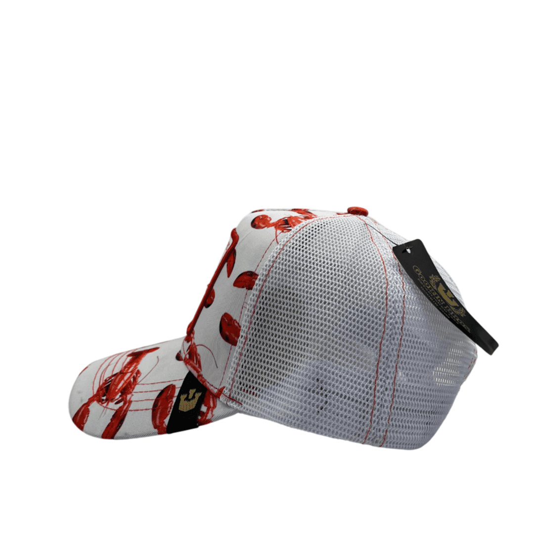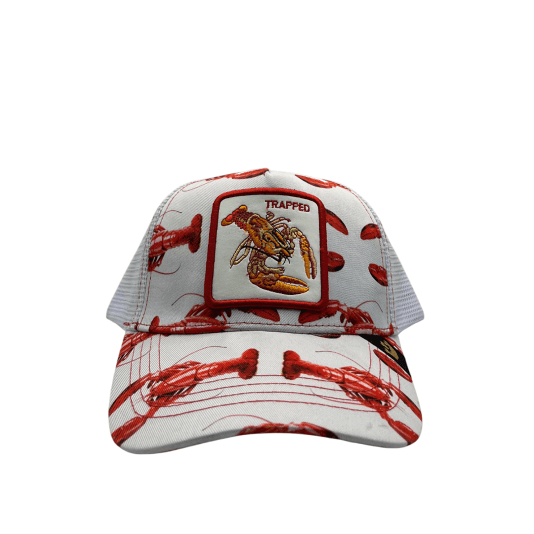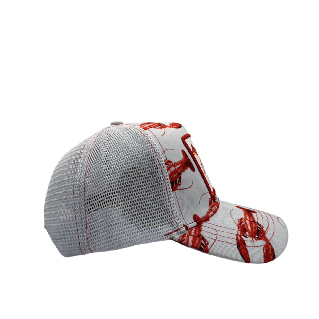 • Stand out with a bold and unique marine-inspired cap! This cap features an all-over red lobster print on a white background, creating a striking and playful look. The front patch showcases an embroidered lobster with the word “TRAPPED”, adding a fun and stylish touch.