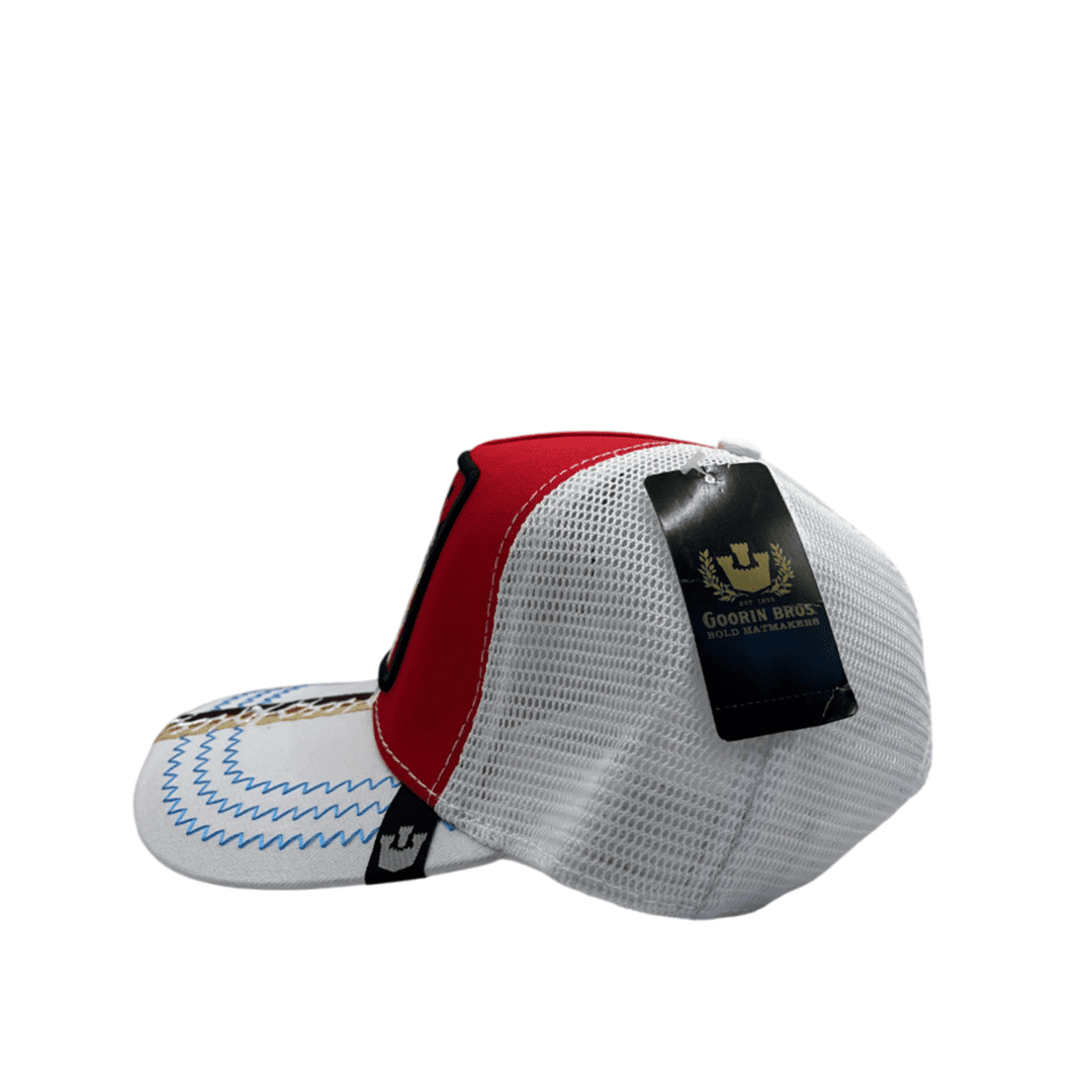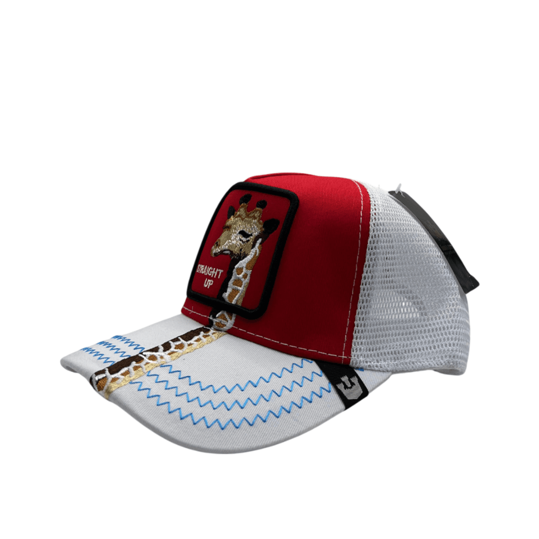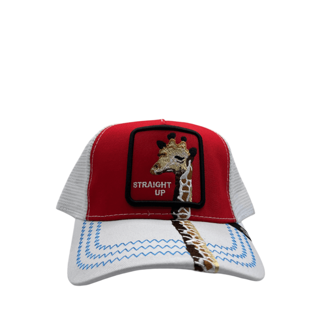 • A stylish and unique cap featuring a bold red and white design. It showcases an embroidered giraffe with the phrase “STRAIGHT UP”, adding a trendy touch. The mesh back ensures ventilation, making it perfect for casual and everyday wear.